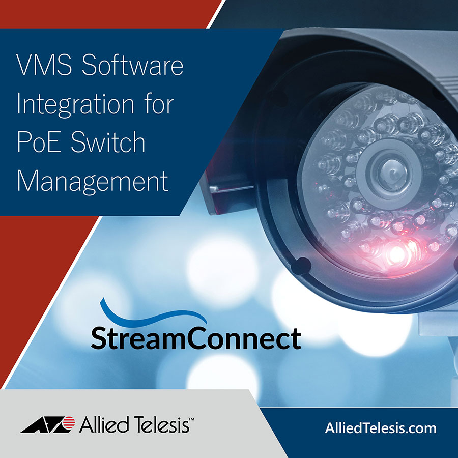 Allied Telesis StreamConnect is a software integration for leading video management systems that provides PoE switch management. It delivers complete visibility and control over Allied Telesis network switches powering video surveillance cameras.