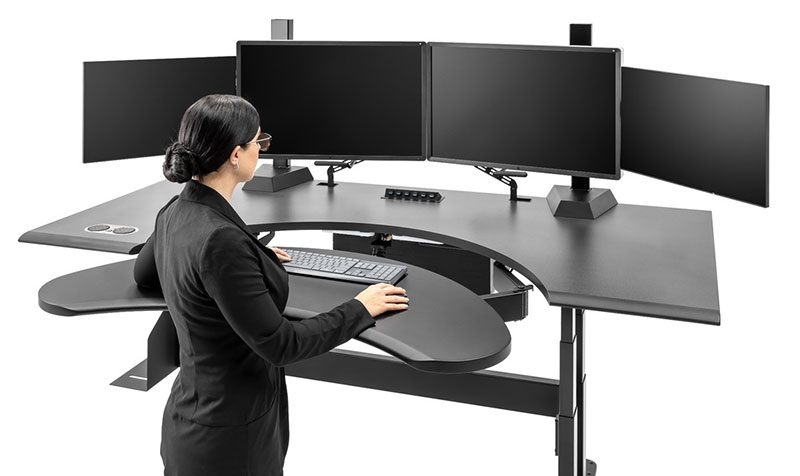 RedRick Glide is an ergonomic workstation for security monitoring pros. Its smooth glide and precise adjustability make it easy to reposition multiple displays for better viewing angles, improved posture, and reduced neck, back, and eye strain during long shifts.